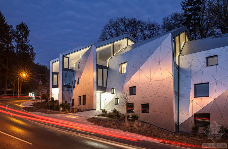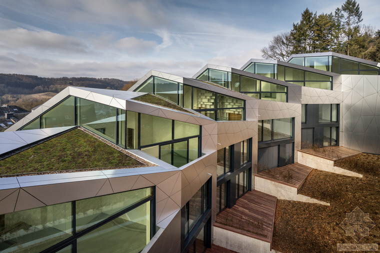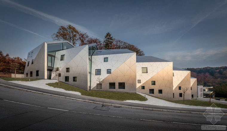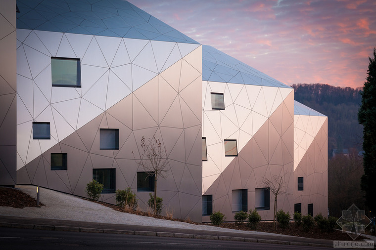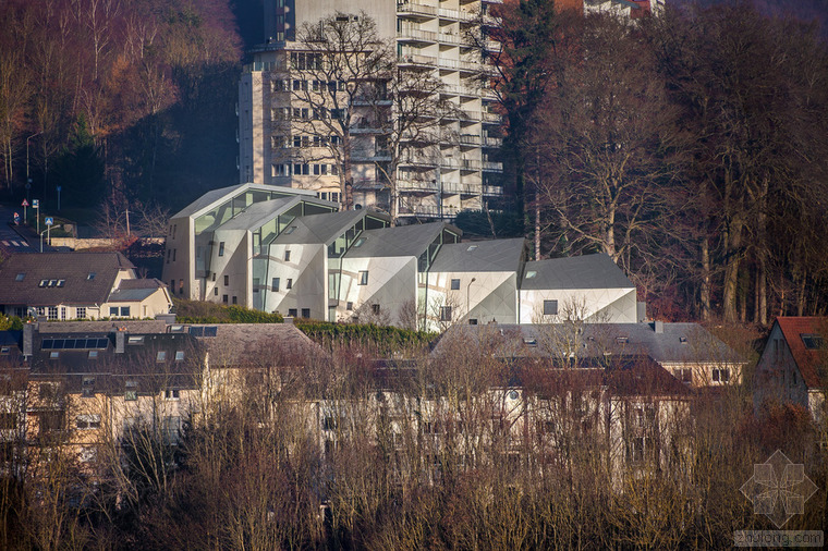根據(jù)城市建筑規(guī)章條例規(guī)范,無論地形有多奇怪,都可以建造簡(jiǎn)易的兩層單體建筑,并且?guī)в械叵率摇5牵車沫h(huán)境、特殊的地形條件和基地的形式造就了各種各樣的建筑,與此同時(shí)也產(chǎn)生了上文所指出的問題。基地位于一條十分彎曲的街道邊緣;地形高差達(dá)10米,非常陡峭;基地上保留有樹齡300年的古樹,且被列為國(guó)家歷史文物。所有的這些狀況使建筑有了最初的形狀。此外,該建筑還呼應(yīng)了特殊的城市環(huán)境(一邊是小體量的住宅單元,而另一邊是大體量的公寓樓。)建筑師通過將主體分成六個(gè)小的、垂直位移的體塊,創(chuàng)造了一個(gè)巧妙地轉(zhuǎn)變。建筑通過這種方法適應(yīng)了環(huán)境,既保持了所需的密度,又賦予其歸屬感、特性和人性化。體塊的分割和位移需要謹(jǐn)慎地研究自然采光的需求、朝向城市景觀的開闊視野,并且創(chuàng)造天地之間的視覺連接,同時(shí)還要保護(hù)住戶的隱私。
